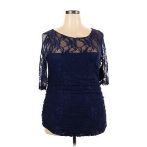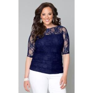 Kiyonna Top Blue Lace 1X Smitten Style Ruched 3/4 Sleeve Feminine Colorful LIned