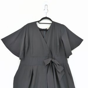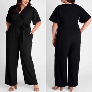 Details: Kiyonna Women 0x Plus US 10 12 Charisma Jumpsuit Black Faux Wrap Crepe V Neck Belted FLAW