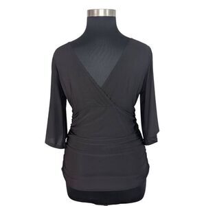 Make your outfit pop with this cute black jersey faux wrap to featuring V-Neck and V-Back, half length flutter sleeves, empire waist and flattering side ruching. Wrinkle resistant so perfect for packing!