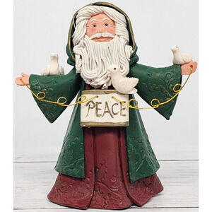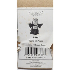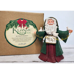 Klassic Kringle, 4" resin Santa free standing figurine from the Klassic Kringle collection, hand-painted finish of resin, holding a peace banner with doves, made in 2005, New in original box.