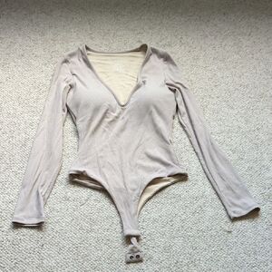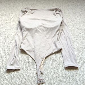 Chic beige bodysuit with long sleeves. Soft fabric for comfort. Ideal for versatile styling.
