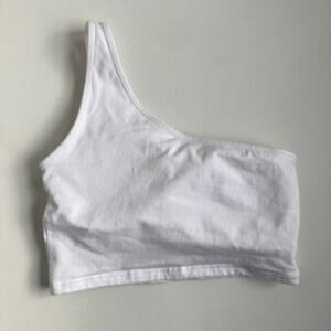 Solid white cropped camisole with built in padded bra. One shoulder strap.