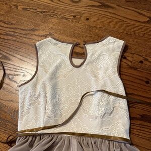 Size medium. Has strings to tie a bow in the back. 100% nylon. Zipper on side