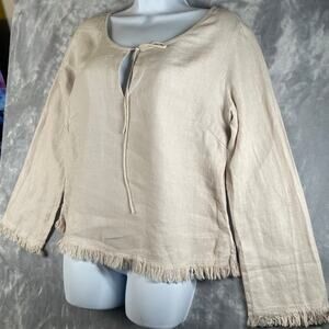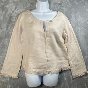 Kleen Linen popover fringed frayed boxy blouse top M long sleeve lagenlook cream