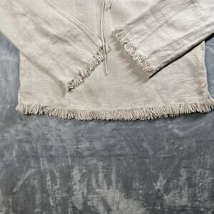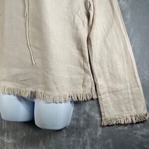 High quality linen top that features a boxy oversized fit, long sleeve, deep scoop neck with tie detail, and frayed fringe seams. Made by Kleen Linen and marked a medium.