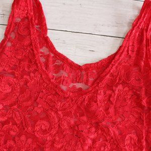 This camisole tank top is gorgeous. It is a beautiful shade of red stretch lace. The mesh is unlined and see through. It is new without tags and has never been worn or washed.