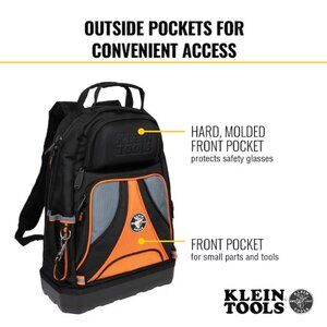 Klein Tools' Tradesman Pro Organizer Backpack features 39 pockets for plenty of tool storage, including a hard, molded front pocket for safety glasses and a front zipper pocket to store loose parts. The bright orange interior will help you find your tools faster. The durable molded base protects from the elements and is water resistant.