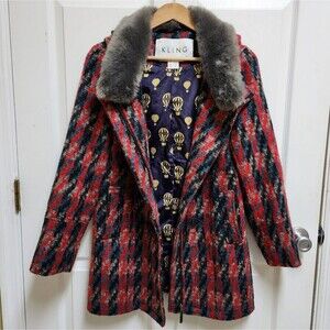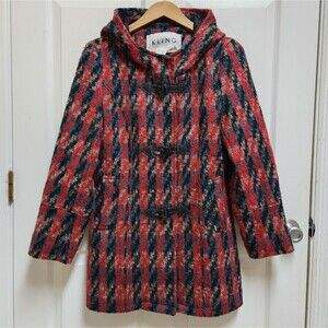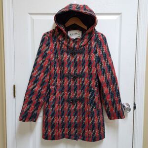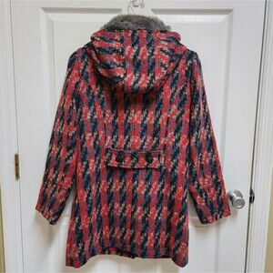 Kling Coat Womens Medium Wool Blend Red Black Multicolor Plaid Stripe Hooded Faux Fur Removable Collar Zip Toggle Lined Preppy Academia Warm Cozy Winter