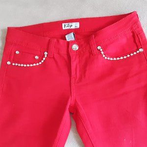 Red full length red denim jeans with rhinestone embellishment coming and going!