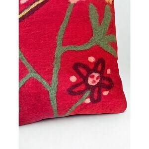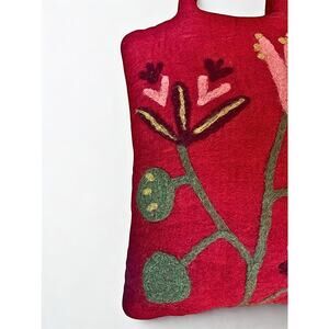 Features a vivid red base with colorful felted floral designs in pink, green, and burgundy tones.