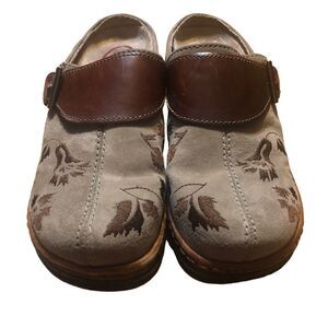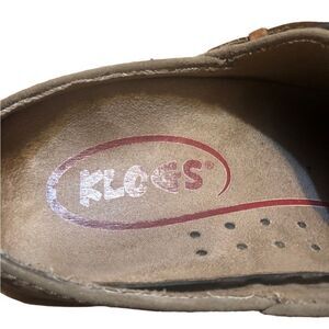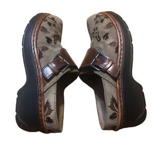 Klogs Austin Jean Slip On Skid Resistant comfort nursing shoe. Skid resistant nonscuff. Leather upper. Leather embossed upper with leaves. Buckle design. Size 7.5. 1 3/4” heel. EUC