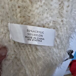 The product is a Kloth & Clover women's cream color asymmetric drape, open front, extremely soft feel, eyelash knit sweater vest in one size. Made from a blend of acrylic and nylon, this sleeveless vest features a cable-knit design, stretch material, and an open front for a bohemian style. Perfect for layering over a variety of outfits, this sweater vest adds a cozy and stylish touch to your wardrobe.