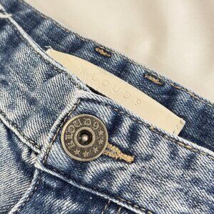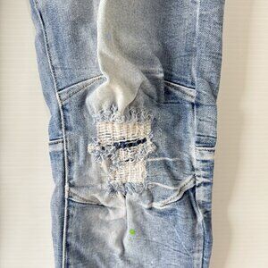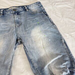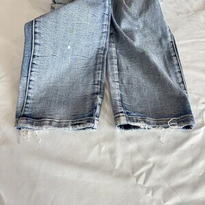 > Condition: These jeans are in GOOD PRE-OWNED CONDITION. They show normal signs of wear consistent with pre-owned denim. Please note they feature factory-distressed/ripped knees with a patched backing, along with intentional faint green and white paint splatters throughout. There is also minor fraying at the hems, which is part of the distressed style. The denim is soft and comfortable with a slight stretch.