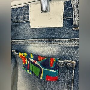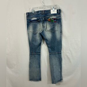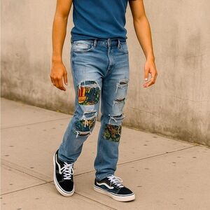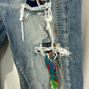 Kloud9 Patchwork Distressed Jeans Size 36x32 Blue Denim Colorful Print Panels