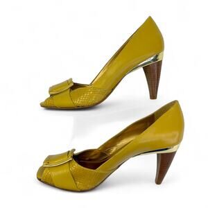 Klub Nico Women's Peep Toe Heels Size BZ 37 US 8 Mustard Yellow Square Buckle