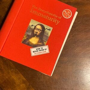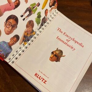 Explore the fun side of life with the Klutz Encyclopedia of Immaturity. This vibrant red coffee table book is perfect for adding a playful touch to your home decor.
