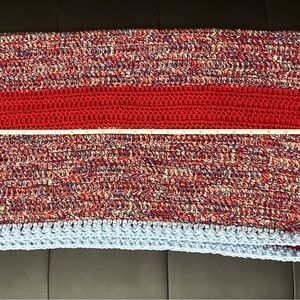 Wrap your little one in warmth with this cozy red and blue knitted blanket. Perfect for snuggling, this blanket adds a pop of color to any nursery or playroom. Hand made, crochet. Baby blanket, security Blankket, baby shower gift