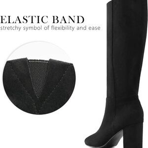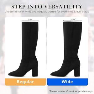 Features: These knee-high boots feature a trendy wide calf fit with a pointed toe and chunky 3-inch heel that helps elongate your legs and adds a touch of sexy sophistication. The faux suede material feels soft and luxurious against your skin, and the pull-on style makes for easy on and off. Padded latex cushioning plus a skin-friendly lining ensure all-day comfort, whether you're out shopping or hitting a casual dinner.
