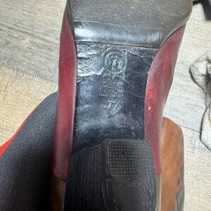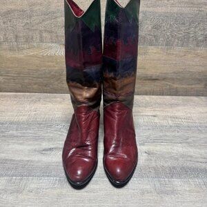 This product is a knee-high leather patchwork boot for women in size EU 37.5 (US 6.5). It features a pointed toe and a low Cuban heel, making it a stylish yet comfortable choice for any casual or western-inspired outfit. The multicolor design adds a trendy touch to the Southwestern boot, while the pull-on closure makes it easy to wear and take off. Made with high-quality leather, this boot is durability and fashionable for the modern woman.