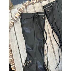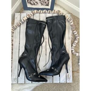Knee Length Black Heeled Buckle Stud Zipper Boots