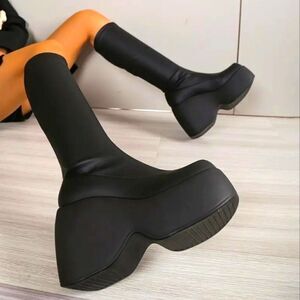 Women's Platform Chunky Heel Knee High Boots, Fashion Solid Square Toe Slip On Stretch Long Boots, Goth Style High Heels
