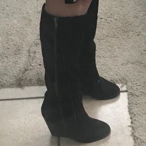 I order these from shoe dazzle, a few years ago, they are in excellent condition. I wear them a few times. The top part of the boots are wide open, I’m a plus size gal, they fit great, they are very pretty wide open, I saw them on a girl once and fell in love with them, like I said I’m a plus size gal. They are 7.5, I fit in a 7.5 and 8.