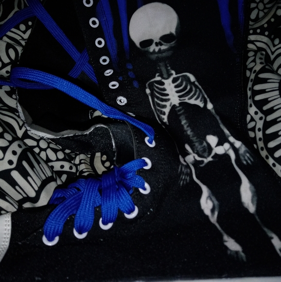 knee high skull design zip up shoes looks like blue blood running down them their blue and black knee high with a skull on them size 10 but fits like a 7