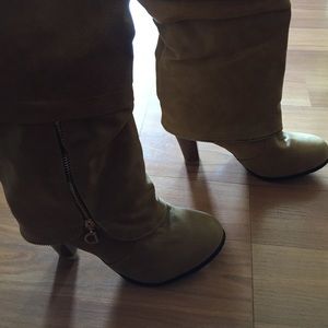 Carmel color, knee-high boots with gold hardware. New, never worn. No box. Actual size on shoe says a 41, but fits like a size 9