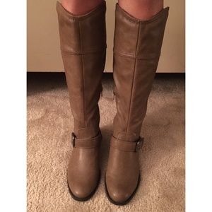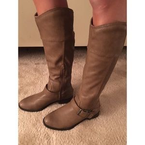 Faux leather. Taupe with brushed gold-finish buckles. Size 6 and they run slightly small. Your feet should be between 5.5 and 6. Comes up to just below knee. Like new condition. Barely worn. Price is firm. Originally $34.95 from JustFab.