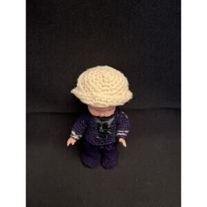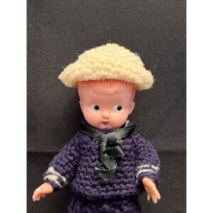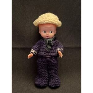 This Knickerbocker vintage celluloid side eye boy rattle doll is a charming addition to any collection. Dressed in a navy crochet sailor uniform, he features molded straight red hair and black eyes. Measuring 6 inches in length, he is an original and interactive collector toy with removable clothes and frozen legs.
