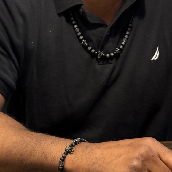 A sleek metallic finish adds a touch of suave to this black on black beadwork design & gives these pieces a bold and distinctive appeal.