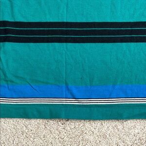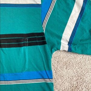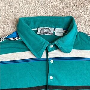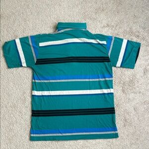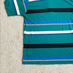 This polo shirt showcases a stylish striped pattern in blue and green, perfect for casual outings. Crafted from a soft knit fabric, it ensures comfort and breathability for warm weather.