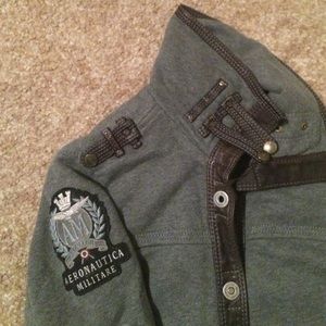 Edgy military style jacket the button up, has plenty of pockets, and a branded arm patch. Authentic leather trim. Cuffs button and zip, collar folds down, or can be worn buttoned up. Made in Italy. Size 40, fits like a small.