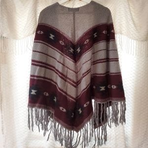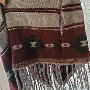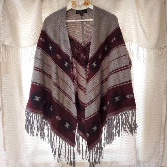 Grey, black, & maroon knit Aztec printing. Fringe at the bottom. Open front and sleeveless. Great condition. Pet free home.