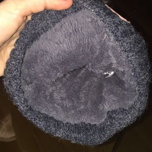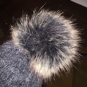 Excellent condition gray knit beanie with faux fur pom at the top. This was purchased at a market in NYC last winter and worn only a handful of times. The inner part of the hat is lined with a very warm and super soft fleece-like fuzzy material.