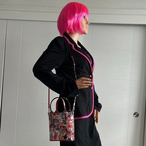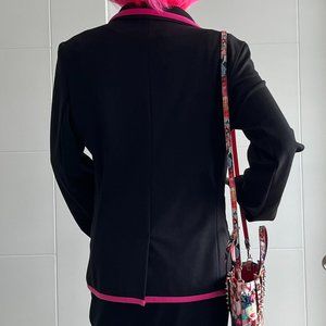 Black blazer with bright pink trim with 2 button center close. Great for travel, this knit blazer does not wrinkle. The fabric is 77% poly/20%viscose/3%spandex, unlined. Dual patch pockets at front are functional, also bust pocket. Size M measured flat fits up to 38" bust & hips, 34" waist and is 24" in length. Purchased at Neiman Marcus by Wilster, 12 years old, pristine used condition, retailed for $225. Weight is 1 lb. 1 ounce.