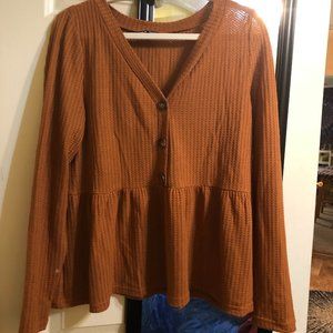 Super soft, never work peplum-style shirt. It's rust orange-colored, size XL but fits more like a L.