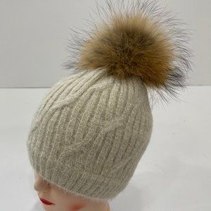 100% Acrylic Knit Cable Beanie with Real Fox Fur Pom