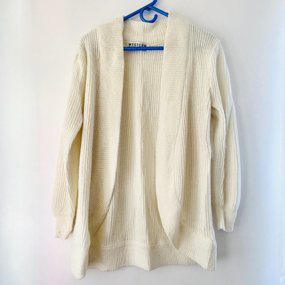 Western Connection knit cardigan is so pretty! The cardigan is a creme color and is so comfy! Tag with the size was taken, but it looks like a Medium.