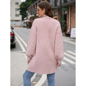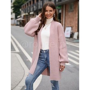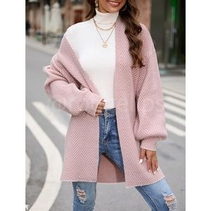 Knit Chevron Open Cardigan Bishop Sleeves Hip Length Pink & White