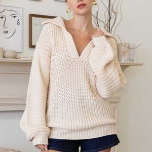 Knit Collar V-Neck Long Sleeve Sweater Cream