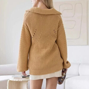 Knit Collar V-Neck Long Sleeve Sweater Tan Taupe