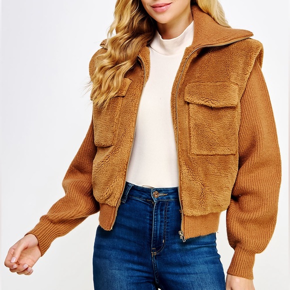 Collared jacket with knit sleeves and sherpa bodice. Lined with two front pockets. Very warm. Brand new with tags. Never worn.