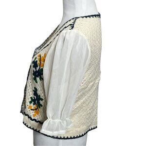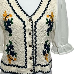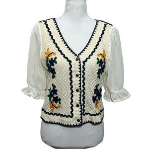 Knit Crochet Button Blouse Women’s XS White Puff Sleeve Embroidered Cottagecore