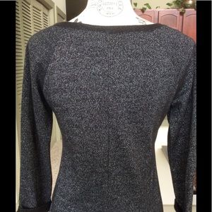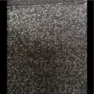 Black knit dress with silver metallic sparkle throughout. Metal accents on sleeves. 3/4 length sleeves. Fits true to size. Stretches. 76% cotton, 16% polyester, 8% metallic. Cute with tights and boots.