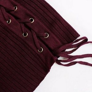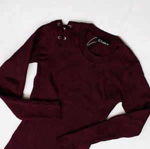 Wine colored long sleeve knit dress. Decorative ties on right shoulder and left thigh. NWOT, never worn / never washed