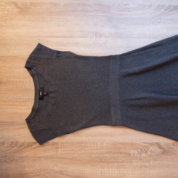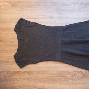 Cute and comfortable gray knit dress with full skirt. Looks great styled with tights, boots, scarf and jacket.