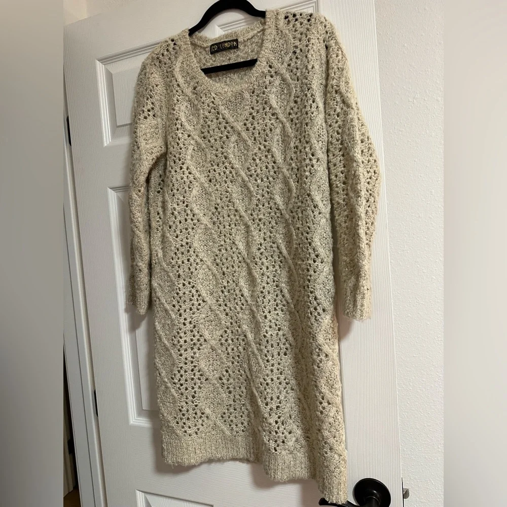Knit dress by Qed London. Warm and stylish but see through. Can be worn as a tunic or a dress. May require slip dress.