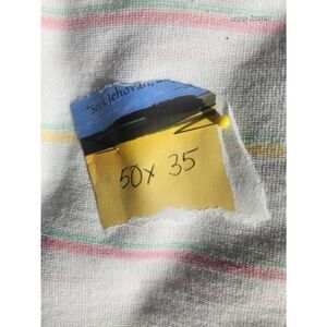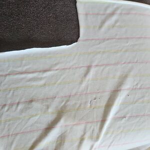 ▪︎DESCRIPTION: White with pink yellow and green stripes. Lightweight knit fabric. For sewing or crafts