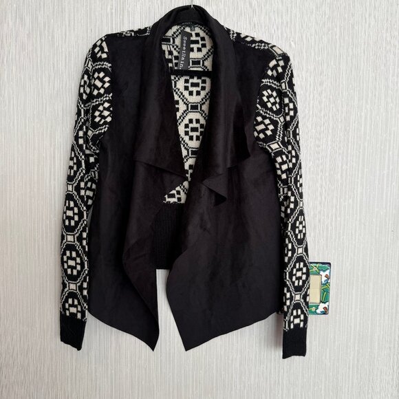 Black and white sweater. Knit back, faux suede front. Comfortable, lightweight, and gorgeous. By Sweet Rain. Acrylic yarn. Size M.